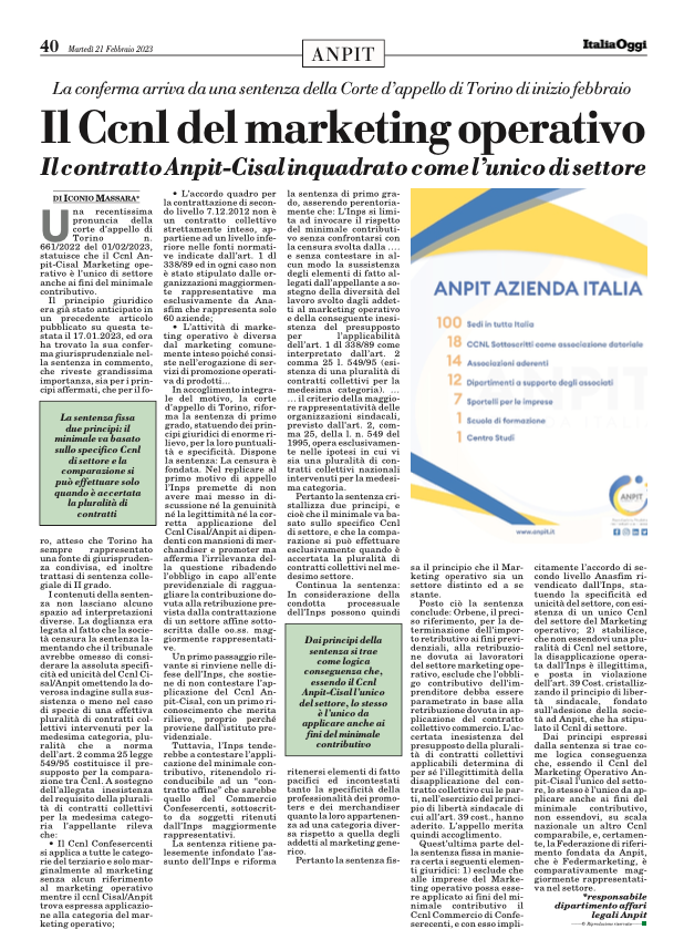 Una recentissima pronuncia della corte d’appello di Torino n.661/2022 del 01/02/2023, statuisce che il CCNL Anpit-Cisa Marketing operativo è l’unico di settore anche ai fini del minimale contributivo…